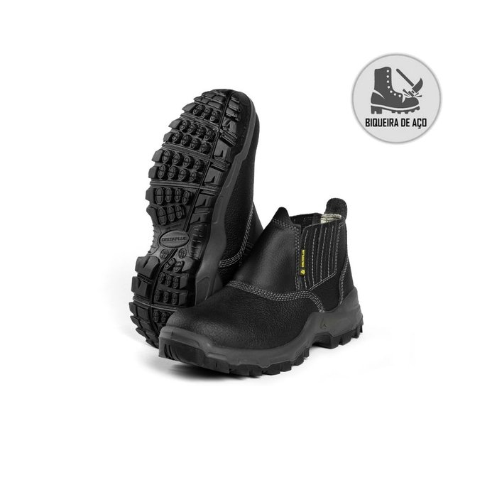 BOTA DE SEGURANÇA ELÁSTICO COURO PRETO DELTA PLUS SAMPA OB SRA CERTIFICADO DE APROVAÇÃO: 45269 BIQUEIRA AÇO Botina ocupacional (OB) de elástico lateral, acolchoada, confeccionada em couro grupon, biqueira plástica, sobrepalmilha antibacteriana e solado de poliuretano (PU) bidensidade injetado bicolor diretamente no cabedal. Oferece resistência ao escorregamento em piso cerâmico com detergente (SRA) e resistência a hidrocarbonetos (FO). CABEDAL Cabedal desenvolvido em couro grupon estampa relax com espessura de 1,6 a 1,8 mm. FORRO INTERNO Forro em manta de não tecido agulhado. PALMILHA DE CONFORTO Palmilha plana em EVA de 5 mm higiênica PALMILHA DE MONTAGEM Palmilha de montagem em manta de não tecido dublado com EVA 2,5 mm. SOLADO Solado tecnologia COMBO bidensidade em poliuretano, injetado diretamente no cabedal. Oferece alta capacidade de flexão no caminhar e estabilidade de movimento na área de absorção de impacto. NORMA NBR ISO 20347. CA 45.269 I) Aprovado para proteção contra impacto no nível de energia de no mínimo 200 J e contra a carga de compressão de no mínimo 15 kN. II) Calçado com resistência ao escorregamento em piso de cerâmica contaminado com lauril sulfato de sódio (detergente) (SRA). III) Solado resistente ao óleo combustível (FO). INDICAÇÕES DE USO Botina para indústria e construção. SETORES AGRICULTURA / ÁREAS VERDES OBRAS PÚBLICAS / CONSTRUÇÃO CIVIL REFORMAS / AUTÔNOMO INDÚSTRIA LEVE SERVIÇOS / LOGÍSTICA PETRÓLEO / GÁS INDÚSTRIA MINEIRA SETOR EÓLICO LIMITAÇÕES (1) Não usar caso o solado esteja com desgaste dos cravos. (2) Não usar quando o cabedal estiver rompido. ADVERTÊNCIAS (1) Não usar onde tem risco de queda de objetos sobre os artelhos (2) Não usar onde tem risco de perfuração. (3) Não usar em ambiente com risco elétrico. (4) Não usar em alta temperatura. (5) Não usar em ambientes com grande incidência de água. MANUTENÇÃO Remover o excesso de sujeira a cada sete dias. LIMPEZA Lavar com água; não usar sabão neutro; secar à sombra em local ventilado; retirar a palmilha para arejar; aplicar graxa ou pasta para renovação de couro. VALIDADE 36 meses a partir da data de fabricação gravada no calçado. VIDA ÚTIL Não é possível determinar a vida útil dos calçados, pois depende de fatores como aplicação, conservação, higienização e da responsabilidade do usuário na escolha correta do EPI para o uso pretendido. Quando o produto for colocado em uso o responsável pela área de Higiene, Segurança e Medicina do Trabalho deverá avaliar as constantes exposições do calçado como sol, frio, calor, produtos químicos, contaminações entre outros, determinando através destas avaliações a periodicidade de substituição do EPI, considerando que estas condições são variáveis aos mais diversos tipos de atividades de trabalho. A extensão da vida útil pode ser obtida por meio de cuidados como higienização periódica, boa conservação e cautela quanto à aplicação e utilização do produto.