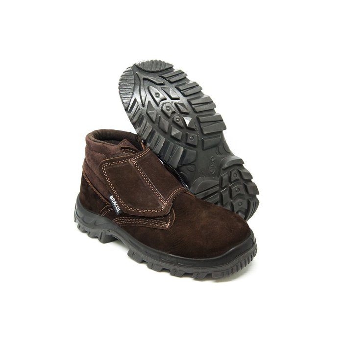 Bota de Segurança Couro Nobuck com Velcro Bracol 4018BVL4600LL Biqueira PVC (Plástico/não resistente/flexível) Certificado de Aprovação (CA): 25.684 Botina para uso ocupacional com fechamento por velcro, confeccionada em vaqueta estampa relax, colarinho acolchoado, forro interno na gáspea não tecido e forro do cano em tecido 100% poliéster dublado com manta de não tecido, solado injeção direta bidensidade bicolor e sobrepalmilha de EVA. Descrição do Calçado: Modelo botina de velcro acolchoada, de uso em diversos ambientes de trabalho, calçado que proporciona conforto e que atende a todas as Normas de segurança da ABNT NBR ISO 20345, 20344 e 20347. Altura (base nº 40): 120 mm Descrição dos Componentes CABEDAL Padrão: Confeccionado em couro relax 17/19 linhas, com colarinho em napa couro soft 09/11 linhas acolchoado com espuma de PU de 15 mm. FORRAÇÃO Padrão: Forração da gáspea com material de não tecido e forro do cano em tecido dublado, com melhor absorção e dessorção de suor, proporcionando melhor micro clima interno aos pés. Contraforte de 1.5 mm, que é a parte mais estruturada do calcanhar, escondida entre o avesso e o cabedal, utiliza-se material termoplástico conformado que proporciona uma melhor conformação aos pés. BIQUEIRA: Biqueira de plástico para conformação. PALMILHA Padrão: Palmilha de montagem de E.V.A conforto costurada com sistema strobel. Sobrepalmilha SOFTSYSTEM em EVA soft com excelente memória, espessura de 4 mm trazendo conforto aos pés. SOLADO Padrão: Solado bidensidade constituído de duas camadas de poliuretano (PU) expandido e injetado diretamente ao cabedal proporcionando maior conforto e resistência a abrasão. A 1ª camada (entressola) mais macia e leve proporcionando maior conforto, e a 2ª camada é a mais resistente a objetos cortantes perfurantes e a abrasão pelo fato de ser a mais compacta. Canais de escoamentos mais espaçados, ranhuras de aderência melhor mobilidade ao caminhar.