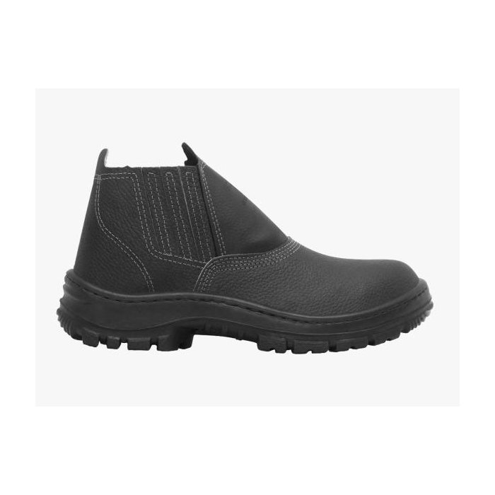 Calçado ocupacional tipo bota até o tornozelo (botina), fechamento em elástico lateral, confeccionado em couro raspa na cor preta, palmilha de montagem em não tecido montada pelo sistema strobel, solado de poliuretano monodensidade na cor preta, com ressaltos, blaqueado, resistente ao escorregamento.