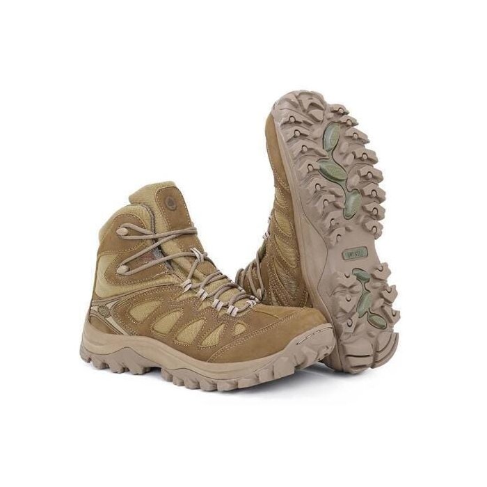 Bota Tática Trekking Hiking Airstep Boot 5700-1 Coyote Bota Hiking confeccionada em Couro de 1.8mm, Cordura 1000DEN, Solado Bi-componente de Borracha com EVA para absorção de impactos e antiderrapante.Possui palmilha anatômica de 12mm de espessura forrada para absorção de suor.