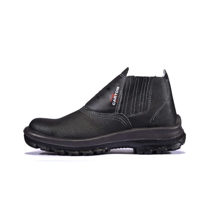 - Botina com elástico nas laterais, cabedal em raspa, palmilha de montagem em couro, sem bico de aço, solado de poliuretano bidensidade.