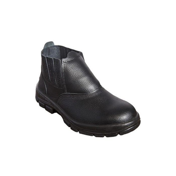 Botina de elástico confeccionada em couro relax na cor preta. Dorso acolchoado em espuma 10 mm. Forro do dorso em tecido, garantindo maior respirabilidade. Forro da gáspea em não tecido. Fechamento com sistema calce rápido com elásticos laterais de trama dupla, recoberto com couro. Costuras simples duplas e quádruplas, feitas com linhas de nylon de alta tenacidade. Contraforte com material termoconformado, totalmente recoberto com avesso em não tecido. Palmilha de montagem costurada no sistema strobel. A palmilha higiênica é antibacteriana e removível. Solado bidensidade PU/PU. Couro relax preto, biqueira plástico/PVC, absorção de impacto, acolchoado, palmilha antibacteriana, resistente a óleo e hidrocarbonetos.