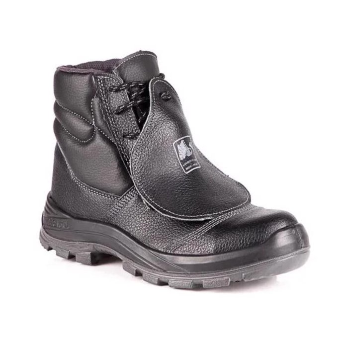 Botina manobreiro de amarrar, língua fole, com protetor de metatarso externo. Confeccionado em couro relax e forração da gáspea, contraforte de 1,5mm de material termoplástico conformado e biqueira em composite.