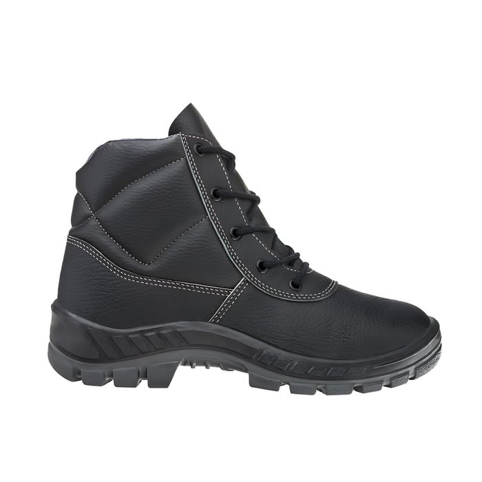 Bota ocupacional com biqueira de plástico, colarinho acolchoado, confeccionada em couro, fechamento em cadarço, forração interna e solado bidensidade.