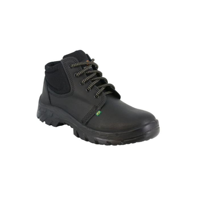 Bota em couro com acabamento em nobuk, com cadarço preto com bege, solado de PU injetado, colarinho acolchoado de espuma com espessura 10mm, língua com sistema aberto, com biqueira de PVC, com forração externa em couro nobuk e com peso de 700grs em cada par (nós usamos como base a numeração 40).
