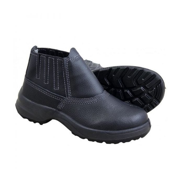 Calçado de segurança de uso profissional tipo botina, fechamento em elástico, confeccionado em couro na cor preta curtido ao cromo, palmilha de montagem em material sintético montada pelo sistema strobel, biqueira de aço, solado de poliuretano bidensidade com propriedades antiderrapantes injetado diretamente no cabedal, resistente à absorção de energia na região do salto e ao óleo combustível.