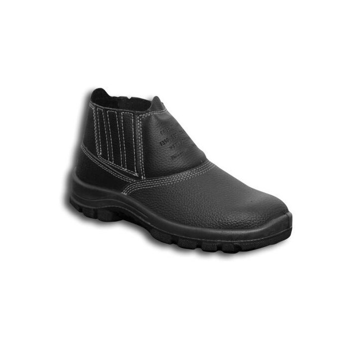 Calçado ocupacional básico, modelo botina, constituída de couro, desenho do cabedal tipo (B), fechamento em elástico. Sistema strobel com palmilha de montagem em não tecido e injeção direta do solado no cabedal . Região do salto totalmente fechada, com resistência ao escorregamento, solado bidensidade.