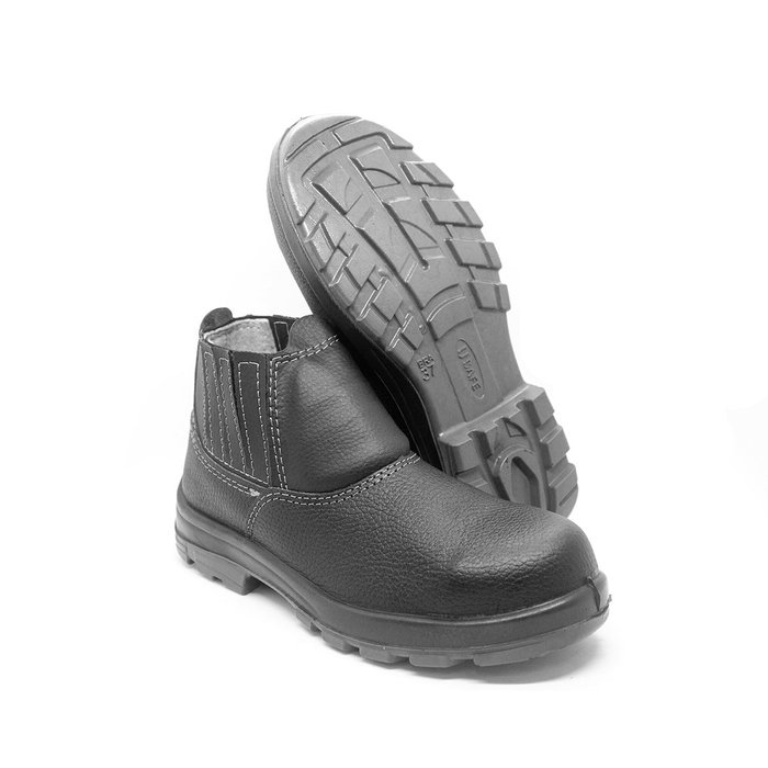 Calçado ocupacional de uso profissional tipo botina, modelo blatt, fechamento em elástico, confeccionado em couro curtido ao cromo, palmilha de montagem em material reciclável montada pelo sistema strobel, com bico de conformação e solado de poliuretano bidensidade injetado direto no cabedal, resistente ao óleo combustível.