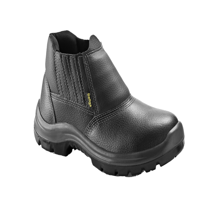 Calçado de ocupacional, tipo botina, com cabedal confeccionado em couro, palmilha de montagem em material não tecido, forro em material não tecido na gáspea e no avesso, sola à base de PU (poliuretano) bidensidade e elástico nas laterais.