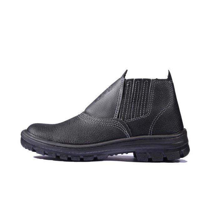 - Botina, modelo blatt, confeccionado em couro vacum, palmilha de montagem em couro montada no sistema strobel, solado de poliuretano monodensidade, com bico de aço.
