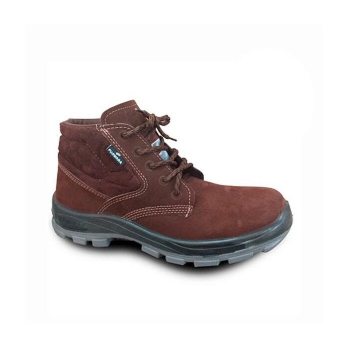 Calçado de segurança de uso profissional, tipo botina, fechamento em amarrar, confeccionado em couro curtido ao cromo, palmilha de montagem em material sintético montada pelo sistema strobel, com biqueira de composite, solado poliuretano bidensidade injetado diretamente no cabedal, com sistema de absorção de energia no salto, resistente ao óleo combustível, para uso eletricista.