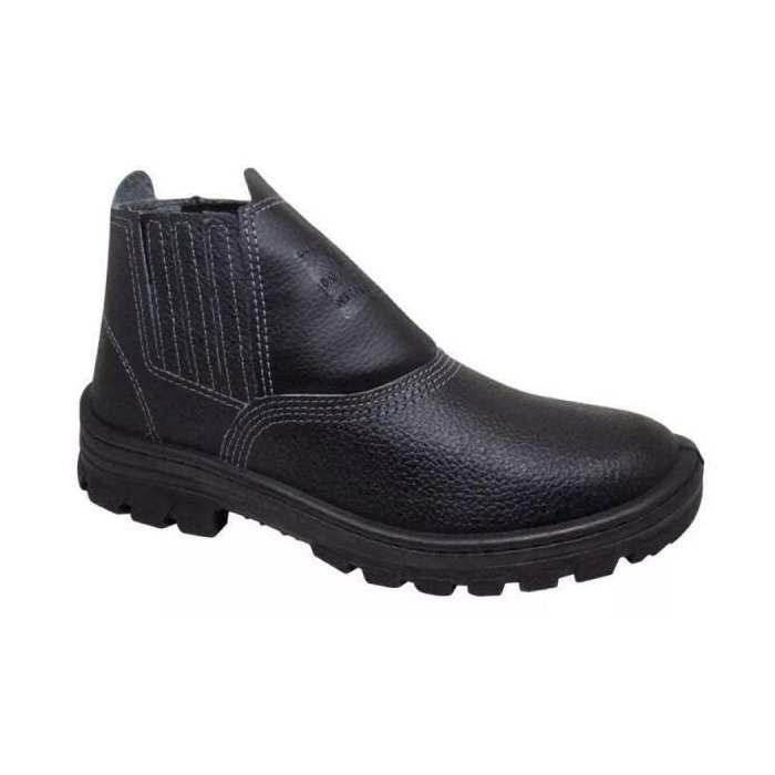 Botina confeccionada em couro, fechamento em elástico, com biqueira de aço, solado monodensidade injetado direto ao cabedal e blaqueado.