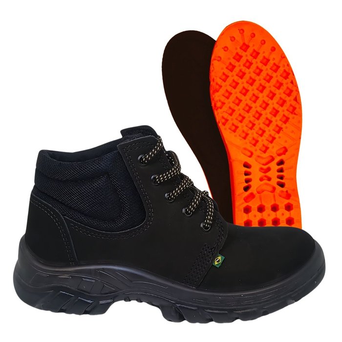 Calçado de segurança tipo botina, com fechamento em cadarço, confeccionado em couro tipo vaqueta curtida ao cromo, forro da gáspea em não tecido, palmilha de montagem em não tecido fixada pelo sistema strobel, solado de poliuretano injetado direto ao cabedal, biqueira de aço, resistente à absorção de energia.