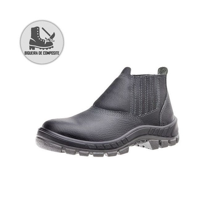 Calçado de segurança tipo botina, fechamento em elástico, confeccionado em couro curtido ao cromo na cor preta, palmilha de montagem em fibras não metálicas resistente à perfuração costurada pelo sistema strobel, forro em material não tecido na cor cinza, solado em poliuretano bidensidade injetado diretamente no cabedal, biqueira de composite, resistente ao óleo combustível, à passagem de corrente elétrica e à absorção de energia no calcanha.