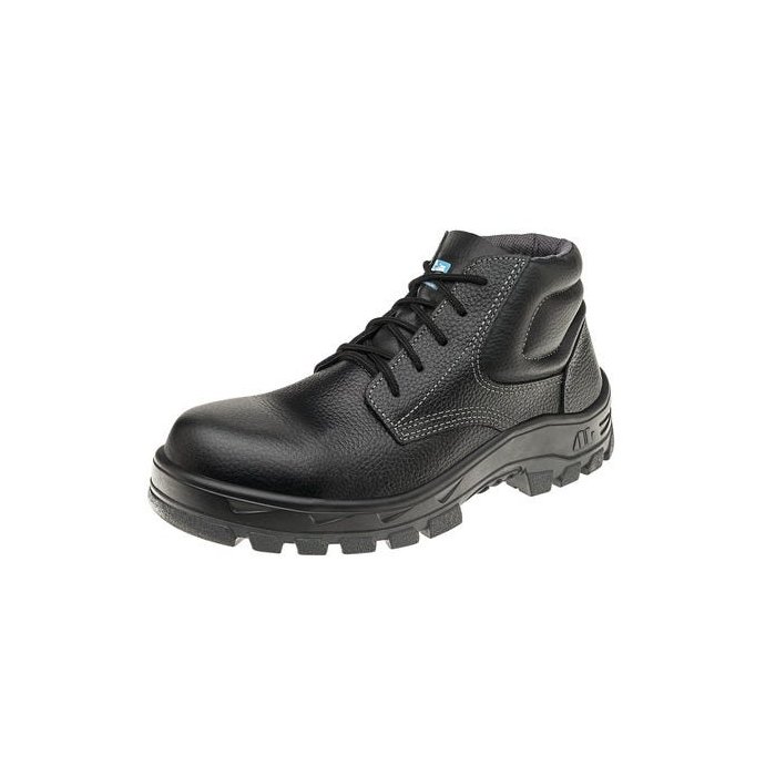 Calçado de segurança tipo botina, fechamento em cadarço, confeccionado em couro na cor preta curtido ao cromo, palmilha de montagem em material sintético resinado na cor branca costurado pelo sistema strobel, forro interno em não tecido na cor cinza, solado bicomponente de borracha e poliuretano injetado diretamente no cabedal, biqueira de composite, resistente ao óleo combustível, à absorção de energia no calcanhar, ao contato com o calor e à passagem de corrente elétrica.