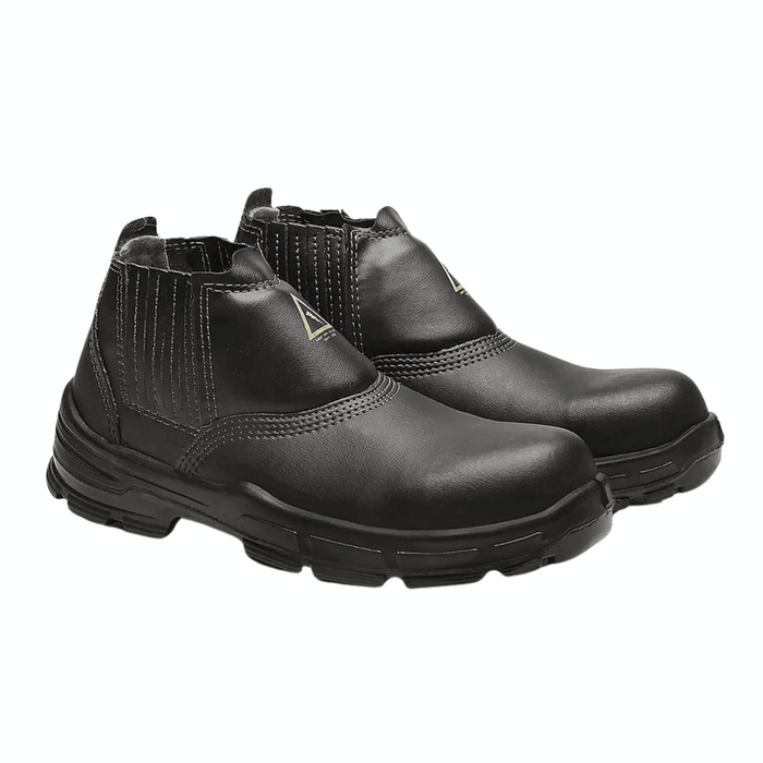 Botina de segurança, com elástico lateral, dorso acolchoado,, palmilha resistente a perfuração (prp) e sobrepalmilha de eva, solado isolante elétrico de poliuretano (pu) bidensidade, constituído por duas camadas, injetado diretamente ao cabedal.