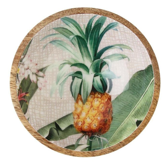 Feito em madeira, possui alta qualidade, acabamento minuncioso e uma estampa tropical.