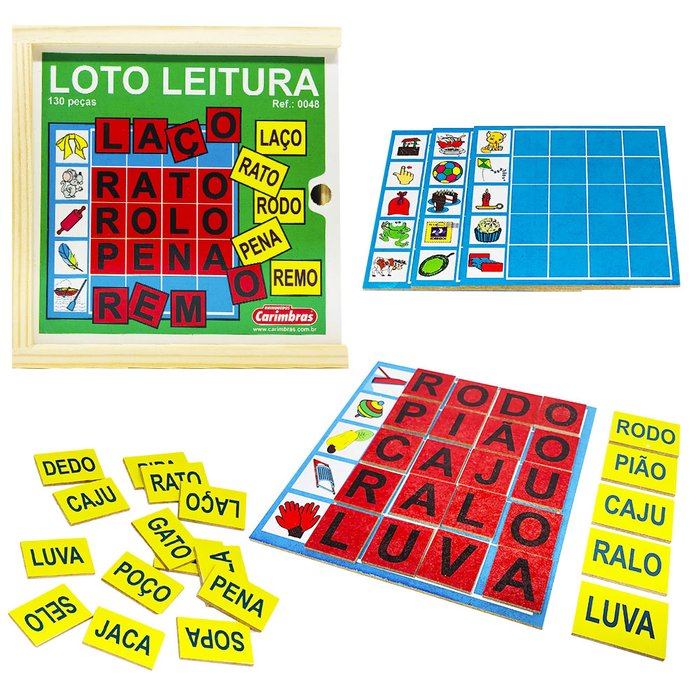 O brinquedo Loto Leitura modelo 0048 da Carimbras, é composto por 130 peças, sendo 5 cartelas, 25 palavras e 100 letras, condicionadas em uma caixa tipo estojo. O brinquedo pedagógico tem como principal objetivo, formar as palavras de acordo com a imagem impressa em cada cartela. Feito todo em madeira, este brinquedo trabalha o cooperativismo, agilidade, português e agrupamento, e é indicado para crianças a partir de 4 anos de idade.