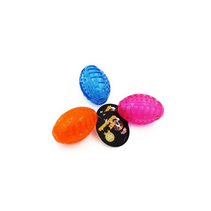 Bolinha no formato de bola de futebol americano de TPR, colorida, super divertida com apito.