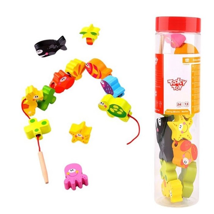 Descrição do Produto As crianças terão horas de diversão passando o cordão pelo buraco dos 12 blocos de animais marinhos.