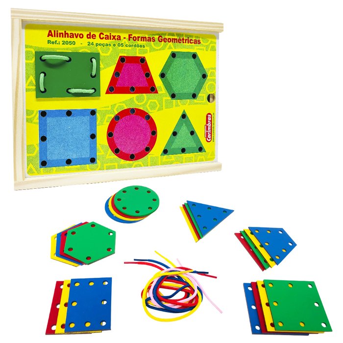 O Alinhavo de Caixa com Formas Geométricas modelo 2050 da Carimbras, é composto por 24 peças com 6 modelos diferentes de formas geométricas além de 5 cordões coloridos, todos acondicionados em uma caixa tipo estojo. O brinquedo consiste em passar os cordões entre os furos, formando a figura geométrica. Feito todo em madeira, este brinquedo educativo trabalha a coordenação motora dos pequenos, forma, tamanho e agilidade, e é indicado para crianças a partir de 3 anos de idade.