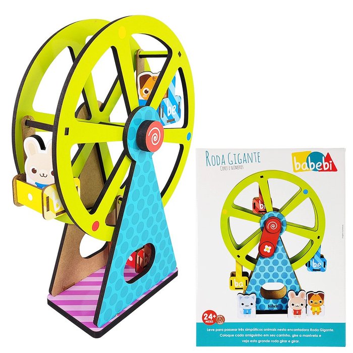 O Brinquedo Educativo Roda Gigante Cores e Números modelo 6000 da Babebi, acompanha 1 roda gigante para montar e 3 peças que representam 1 cachorro, 1 coelho e 1 gato, acondicionadas em uma caixa de papelão, e o brinquedo tem como principal objetivo, desenvolver cenas e histórias além de deixar a brincadeira mais divertida com a roda gigante que pode ser girada através de uma manivela. Feito todo em madeira reflorestada, este brinquedo educativo trabalha com as crianças a criatividade, posição, classe, ordem, percepção e a atenção, e é indicado para crianças a partir de 2 anos de idade.