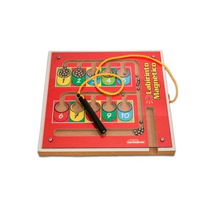O Labirinto Magnético contém 1 (uma) prancha de madeira ilustrada com um labirinto em baixo relevo e com 55 esferas metálicas de 5 mm de diâmetro, tem visor em policarbonato. 1 (um) cursor com imã na ponta para movimentar as esferas.