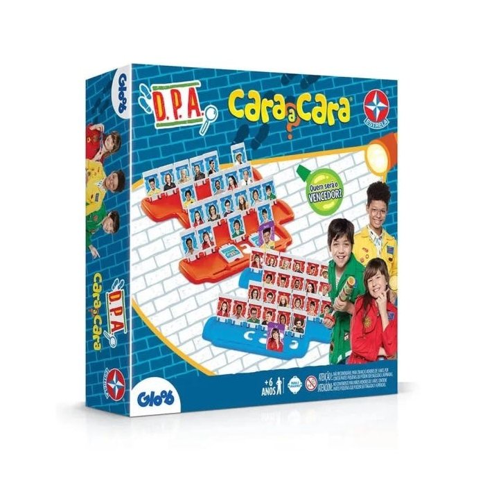 As crianças vão adorar o Jogo Cara a Cara Dpa da Estrela. Divirta-se com a turma do D.P.A., nesse emocionante jogo de adivinhação. Sorteie uma carta sem que seu adversário veja. Você tem que adivinhar a carta que o outro pegou, fazendo perguntas que só podem ser respondidas com Sim ou Não. Ela tem olhos claros? Se a resposta for sim, abaixe as cartas que não tiverem olhos claros. Faça as perguntas certas para descobrir o personagem do seu adversário e ser o grande vencedor. Para 2 jogadores. Contém na embalagem: 2 tabuleiros plásticos, 48 molduras plásticas, 1 folha com 48 rostos, 1 folha com 24 cartas, 4 Pinos e 1 manual de instruções. Objetivo do Jogo é adivinhar qual é a cara do seu oponente primeiro. Imagens meramente ilustrativas.