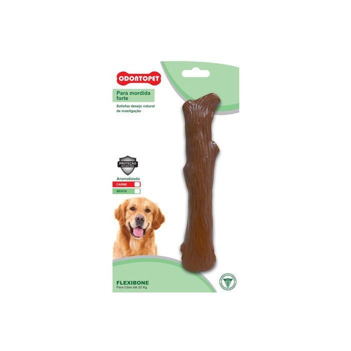 Brinquedo Mordedor Flexibone Tronco Odontopet O Brinquedo Mordedor Flexibone Tronco Odontopet é produzido em resina termoplástica totalmente atóxica com aroma menta irresistível aos cães. A pressão exercida pela mandíbula de um cachorro é considerável, por isso recomenda-se mordedores não comestíveis para encorajar a mastigação. Satisfaz o desejo de mastigar por mais tempo. Diminui o tédio ajudando na limpeza dos dentes. Com material de primeira qualidade, 100% original e com tecnologia antibacteriana natural e específica contra germes, bactérias e outros microrganismos. Comprimento aproximado 18cm • Totalmente atóxico. • Desenvolvido para mordidas fortes. • Satisfaz o desejo natural de mastigação. • Produzido em polímero macio.