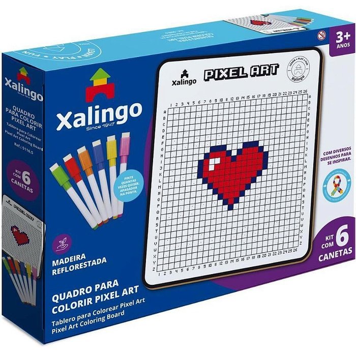 O Quadro de colorir Pixel Art, da Xalingo ajuda a desenvolver a coordenacao motora fina enquanto a crianca se diverte colorindo diversas figuras. Por meio de determinadas criacoes, como veiculos, objetos, entre outros, sempre estimulando suas habilidades. Auxilia no desenvolvimento cognitivo e no senso de observacao da crianca, alem da identificacao de diversas letras, formas e cores. Aperfeicoa o sentido de localizacao, representacao espacial e a capacidade de tomada de decisoes. O quadro acompanha exemplos de “pixel artes” que podem ser reproduzidos com diferentes niveis de dificuldades que acompanham o desenvolvimento das habilidades da crianca. Contem 1 quadro de 33x28 cm e 06 canetas. Indicado para criancas a partir dos 3 anos. Embalagem: UNIDADE. Referência: 51165