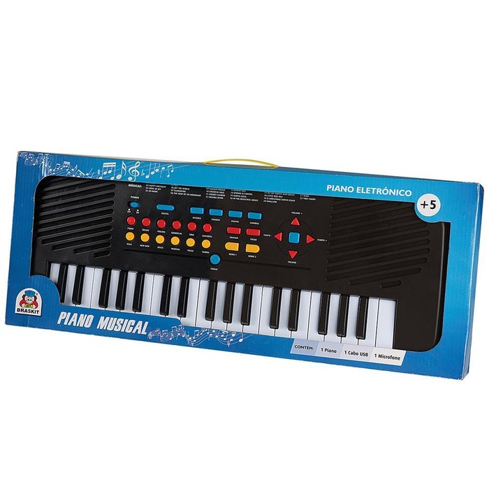 Piano que reproduz várias músicas, efeitos, ritmos e sons. Brinquedo educativo, auxilia no desenvolvimento pedagógico da criança estimulando a capacidade visual, auditiva e a coordenação motora. Pode funcionar com cabo USB ou pilhas. Acompanha um microfone e um cabo USB.
