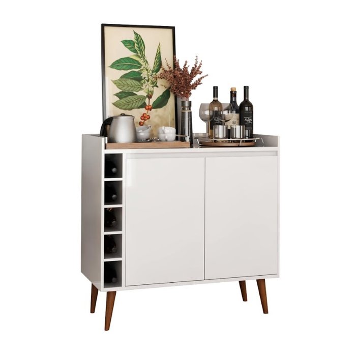 O Buffet com Adega Estilo 2 Portas - MoveisAqui possui um indo desing que garante a sofisticaçãoe o requinte que seu ambiente precisa. Suas portas e adegas organizam com perfeição diversos tipos de utensilios de cozinha, além de garrafas e seu superior possui um amplo espaço para acomodar objetos de decoração e outros itens que precisam estar sempre a mão.