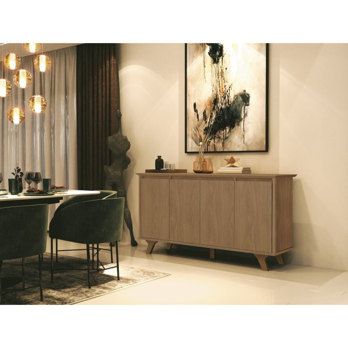100% MPF - Tampo superior com bordas em 45 graus; 4 portas com sistema de fechamento suave e com acabamento fresado e laqueado na parte superior; prateleiras interna com 6 repartições; seus pés retrô em madeira maciça de reflorestamento.