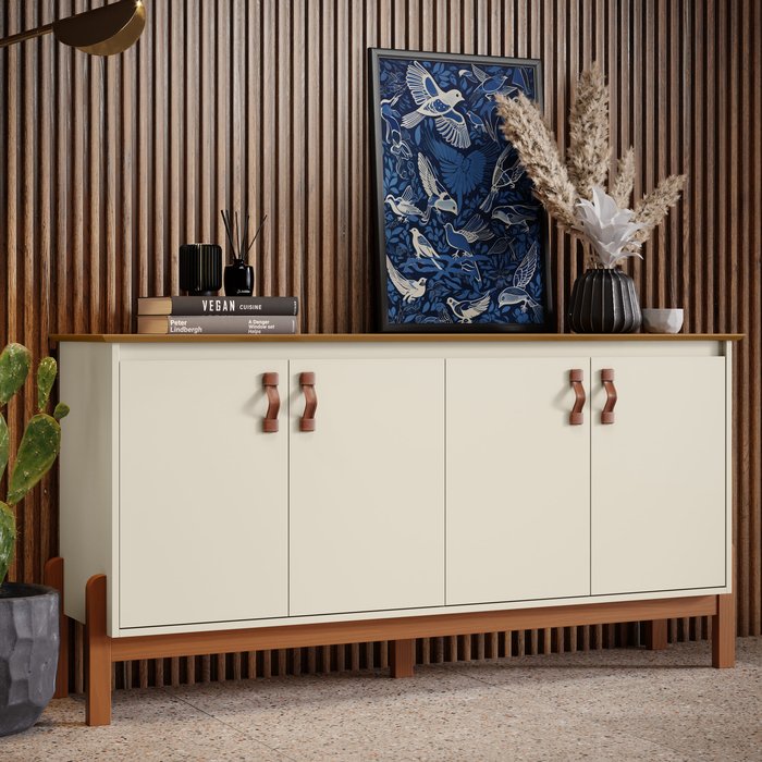Buffet Aparador Balcão com Puxador em Couro para Sala Jantar Estar 4 Portas Sonetto - Offwhite/Freij