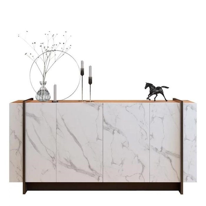 Buffet Aparador Copacabana 4 Portas Calacatta/Natura Real/Preto - PR Móveis