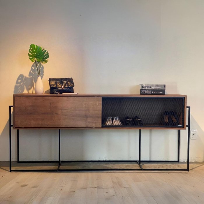 | Informações Complementares (Novo) | Portas deslizantes com sistema de roldanas, uma porta em MDP BP e outra com estrutura metálica e chapa expandida em aço, acabamento em pintura epóxi fosca. Fundo do móvel em HDF BP 3mm. O peso suportado considera a carga distribuída igualmente pela peça. |