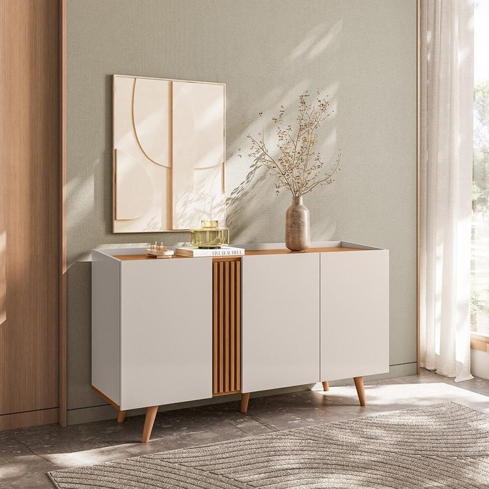 Buffet Capri - 3 Portas Detalhe Ripado Off White Fosco/freijó - Colibri Móveis - Off White Matte Off White Matte