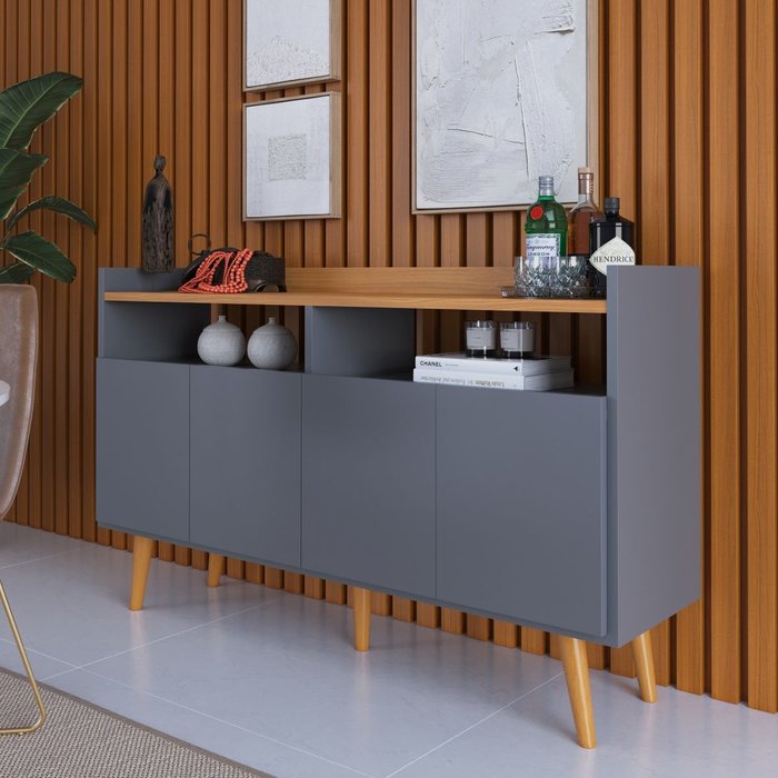 Buffet Intense 4 Portas 2 Nichos Retrô Sala e Escritório - Cinza/nature Cinza/nature
