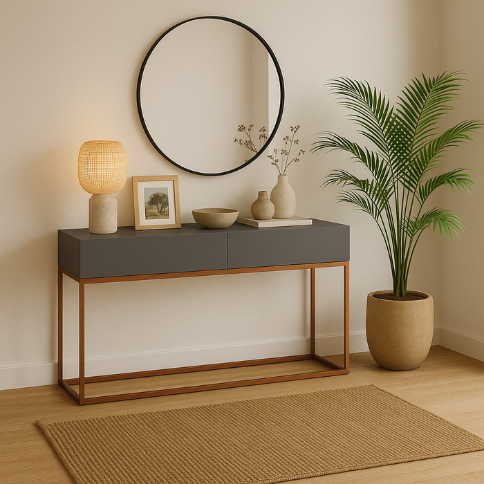 Imagine um móvel que combina o charme industrial com a elegância contemporânea. O Aparador Eros foi desenvolvido para quem busca praticidade sem abrir mão do estilo! Com 2 gavetas de corrediças telescópicas suaves, base em ferro Metalon robusta e acabamento na cor cobre sofisticado, é perfeito para organizar e decorar salas, escritórios ou áreas de jantar. Versátil, funciona como buffet, apoio ou escrivaninha impecável para o ambiente.