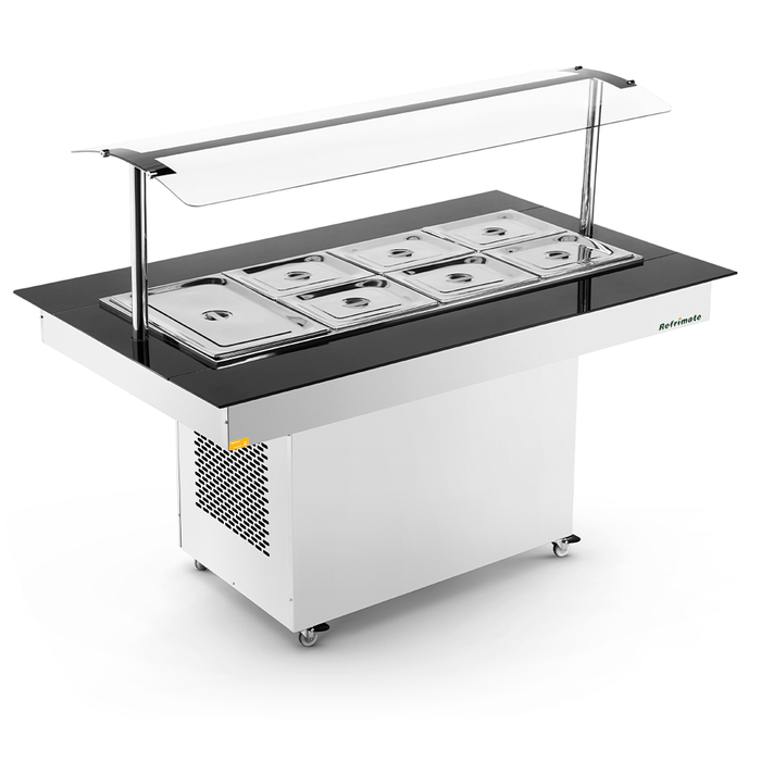 Ele mantém os alimentos refrigerados por meio de uma placa fria na parte inferior e tem um termostato mecânico fácil de ajustar. Na versão para 8 cubas, o buffet mede 1,60m de comprimento, 1m de largura e 82 cm de altura (ou 1,29m até o protetor salivar, que é de vidro curvo temperado de 5mm).