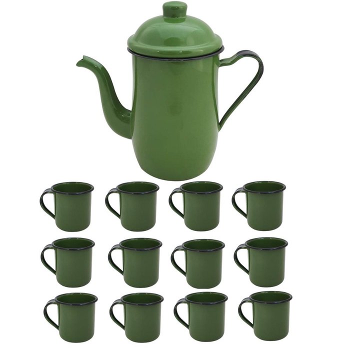 Pequenos cuidados com seu lar fazem toda a diferença.<br><br>#Tradição e Requinte<br>#Pintura Feita a Mão<br>#Xícaras e Bule<br><br>Garantia: 90 Dias / Peso: 800g / Cor: Verde Botânico / Conteúdo: 1 Bule Esmaltado 1,25L e 12 Xícaras 70ml / Ref: BULEE12XICARAS<br>Dimensões Bule: 20cm (A) x 10cm (D)<br>Dimensões Xícara: 5cm (A) x 5cm (D)<br>Cuidados: Não lavar com materiais abrasivos<br>Capacidade Bule: 1,25L / Xícaras: 70ml<br><br>Material:<br>- Aço Esmaltado: Indicado por médicos de todo o Brasil, sua camada esmaltada age como barreira contra a proliferação de bactérias que podem contaminar os alimentos.<br><br>Lembra-se do cheirinho de café na casa de seus avós, pais ou daquela viagem tão sonhada ao interior? O conjunto de xícaras e bule são ideais para uso em cafés, restaurantes, pousadas, hotéis e também em casa, no momento de servir o delicioso chá e café da tarde, ou aquele café coado na hora após o almoço. As canecas esmaltadas são produzidas há anos no Brasil de forma totalmente artesanal com pintura à mão. É um verdadeiro objeto de luxo e com design da terra do café. O bule esmaltado para café é muito indicado por médicos em todo o território nacional, suas propriedades são benéficas à saúde, principalmente das crianças. Além disso, é um aço de rápido aquecimento.