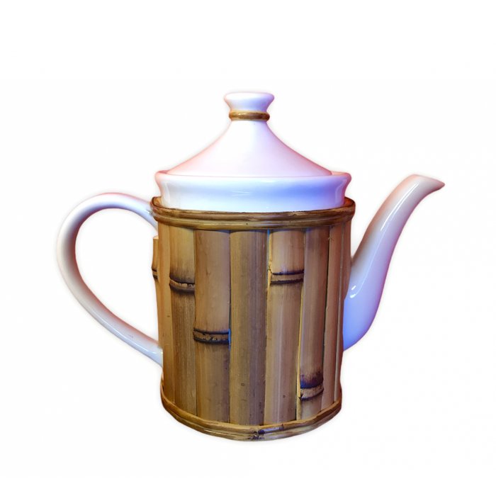 Bule em porcelana bramca revestida com bambu natural é um charme na hora de servir seus convidados
