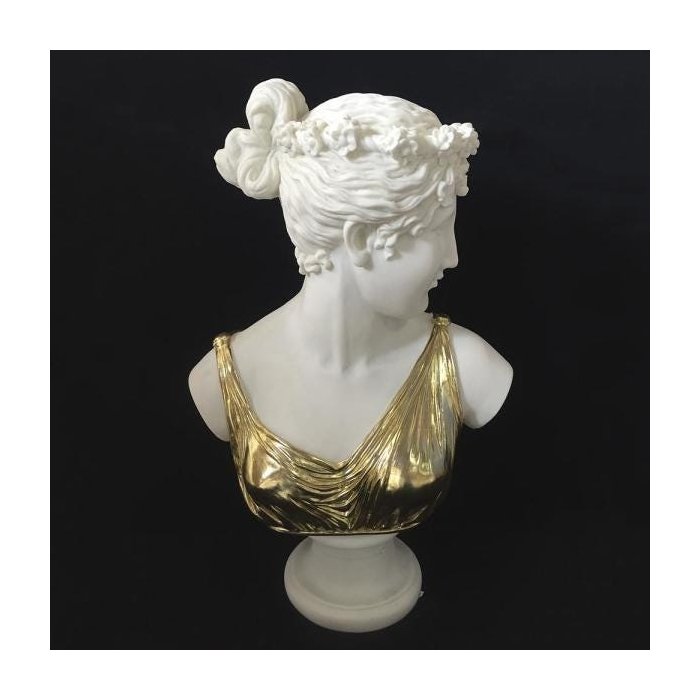 Esta busto em poliresina irá complementar o seu ambiente proporcionando um visual mais agradável e requintado. Perfeito para diversos locais, tais como salas, quartos e etc. Busto em poliresina com detalhes dourados, representando uma figura feminina. Medidas: Altura: 60 cm; Largura: 38 cm; Comprimento: 38 cm; Para conservar aspectos originais do produto utilize pano macio e levemente umedecido com água ou álcool.