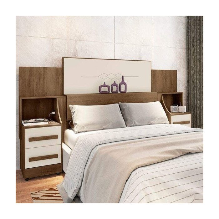 Cabeceira Casal Extensível com 2 Mesas de Cabeceira 4 Gavetas 2 Tomadas Síria Freijó/Off White