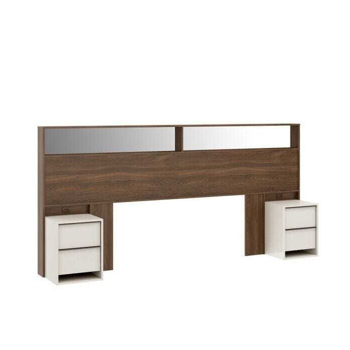 com gavetas de corrediças telescópicas e tomadas para recarga de celulares.Nichos para acomodação de livros e demais objetos finalizados com espelhos trazendo