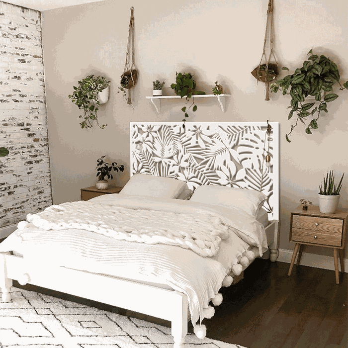 Cabeceira de Cama Garden - BRANCO A Cabeceira Garden no melhor estilo Boho, reproduz um jardim com folhagens. O contato com a natureza tem o poder de aliviar o estresse, proporcionar bem estar e trazer relaxamento, pensando nisso, desenvolvemos esta cabeceira exclusiva, para trazer ao seu quarto um pouco da natureza e seus benefícios. O Cabeceira é vazada, de forma que é possível ver a cor da parede atrás da cabeceira. É um trabalho rico em detalhes, que transforma o ambiente com originalidade, de forma linda e aconchegante. Esta cabeceira foi projetada para se posicionar um pouco mais larga que sua cama. Por isso as medidas são maiores do que o tamanho do colchão correspondente. Podem ser utilizadas com camas box ou demais tipos de cama, pois são fixadas na parede. E você pode escolher a altura que deseja fixá-la. A Maroquina Painéis está sempre buscando inovar para apresentar um produto diferenciado no mercado. Cuidamos dos detalhes para que nossas cabeceiras sejam capazes não só trazer uma decoração aconchegante, mas também um sentimento de conforto e alegria para o ambiente mais importante da casa, que é o nosso quarto, onde relaxamos e sonhamos. Nossas cabeceiras são exclusivas e com alto padrão de qualidade. Sobre o envio: Nossos produtos são enviados por transportadoras, muito bem embalados e protegidos. Envio rápido e seguro. QUAIS SÃO OS TAMANHOS DE CAMA? As camas possuem diversos padrões de tamanho para atender as necessidades de cada pessoa ou do casal. Abaixo você pode conferir os tamanhos de cama mais comuns no Brasil: Cama de solteiro comum: 88 cm de largura. Cama casal comum: 138 cm de largura. Cama queen size: 158 cm de largura. Cama king size: 193 cm de largura. Cama super king size: 203 cm de largura. Cama de viúva/solteirão: 120 / 128 cm de largura. ***As fotos são ilustrativas. ***Não inclui a cama, mesa de cabeceira, tapete, colchas e demais objetos decorativos. FICHA TÉCNICA Dimensões do Produto Largura: 195 cm Altura: 100 cm Espessura: 3 mm Peso: 6 kg Material: MDF Cor: Branco clássico Acabamento: Acetinado Estilo: Boho / Natureza / Cobogó / Vazado Altura: Ajustável Fixação: na parede Forma de fixação: colada com fita dupla face ou fita fecho de contato, ou ainda, aparafusada. Em caso de uso de fitas, observe a quantidade necessária para a fixação.