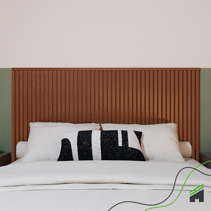 O Kit Cabeceira Painel Ripado já vem cortado e contêm: 15 Ripas de 110cm cada e 1 Perfil de acabamento de 2,5m. Cobre uma área de 150cm