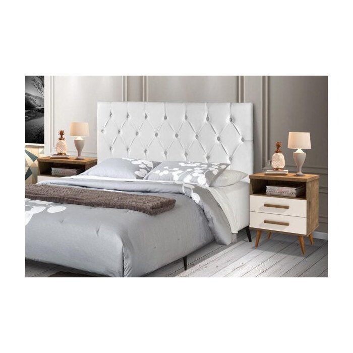 Cabeceira Estofada Box Casal 140 cm Branco com Mesa de Cabeceira Alice Jequitiba com Off White