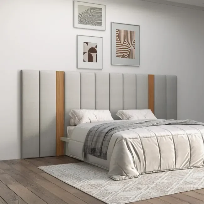 cabeceira para casa de casal estofada de 275cm de largura, na cor freijo madeirado fosco com tecido decorado, acompanha acessórios de montagem e fixação na parede, utilizada em quartos, design moderno.