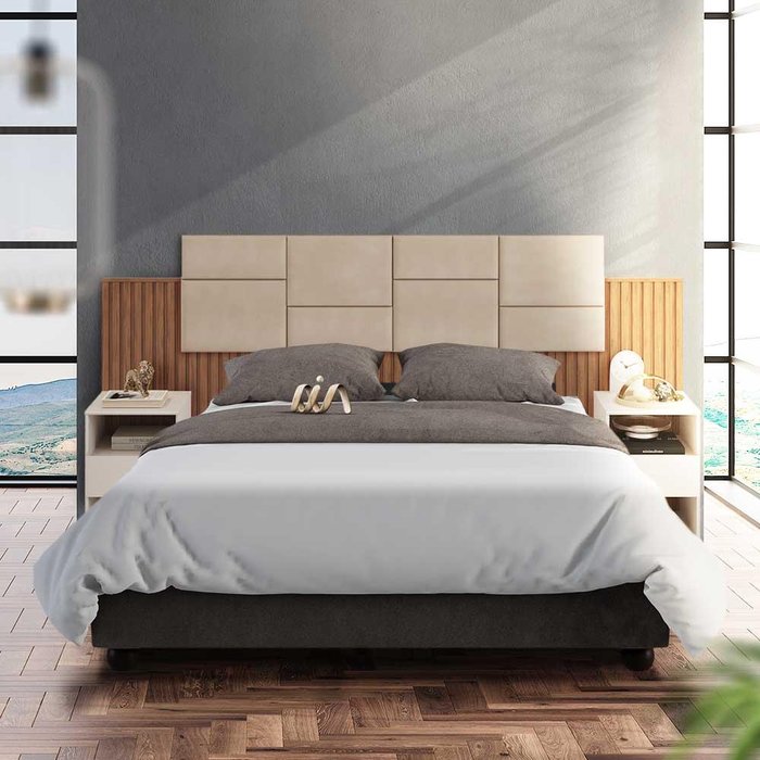 Cabeceira Estofada Ripada com 2 Mesas de Cabeceira Casal Queen Freijó Veludo Kraft Ashley Jm Mó